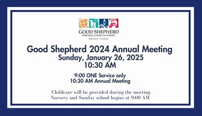 Each year, Good Shepherd is canonically required to conduct an Annual Meeting by the conclusion of January. This year our meeting is scheduled for Sunday, January 26, 2025, following the 9:00 a.m. worship service. We will meet in the church.