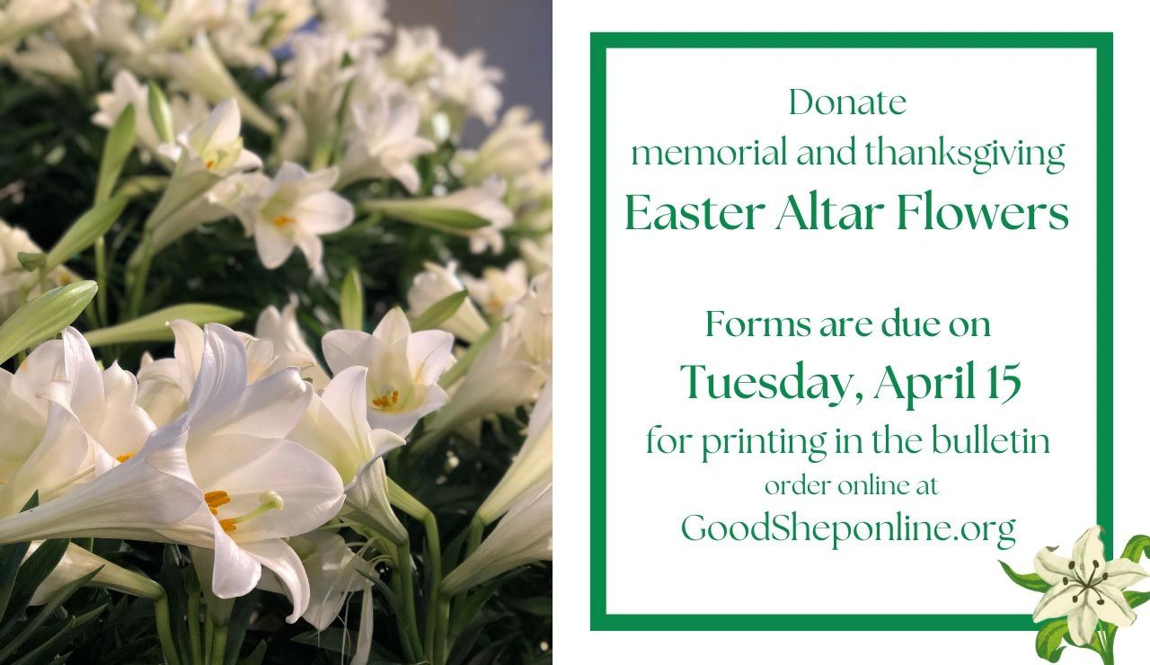 Use the online order form below to make your donation of Easter Altar Flowers for memorial and thanksgiving. Forms are due Tuesday, April 15 for printing in the bulletin.