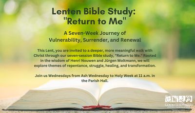 A Seven-Week Journey of Vulnerability, Surrender, and Renewal This Lent, you are invited to a deeper, more meaningful walk with Christ through our seven-session Bible study, "Return to Me." Rooted in the wisdom of Henri Nouwen and Jürgen Moltmann, we will explore themes of repentance, struggle, healing, and transformation. Lent is more than a season—it is an invitation. An invitation to embrace our woundedness as a place of healing, our doubts as a doorway to deeper faith, and our emptiness as a space where Christ meets us. Each week, we will journey with Scripture, reflecting on Christ’s path from the wilderness to the cross and, ultimately, to the hope that is to come. Join us Wednesdays from Ash Wednesday to Holy Week at 11 a.m. in the Parish Hall.